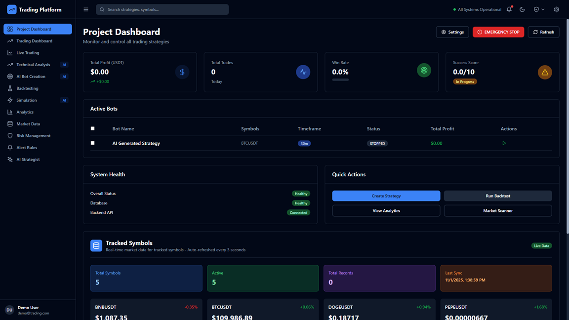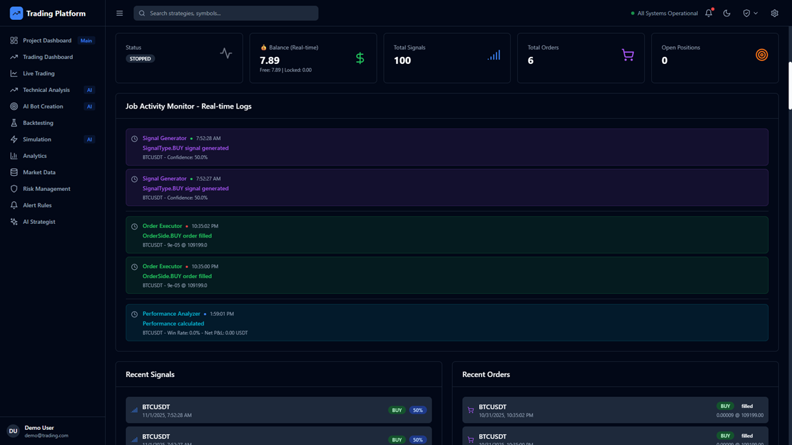 Built for day traders, swing traders, and long‑term investors alike, the platform combines speed, intelligence, and resilience. Security is first‑class—AES‑256 encrypted keys, signed requests, no withdrawal access, IP whitelisting—backed by 99.9% uptime, auto‑recovery, and continuous health monitoring. Whether you’re launching your first bot or scaling a fleet of strategies, you’ll trade smarter, execute faster, and make consistently better decisions with AI at your side.