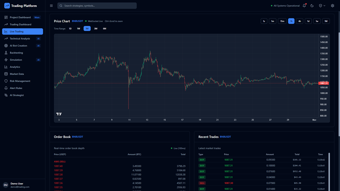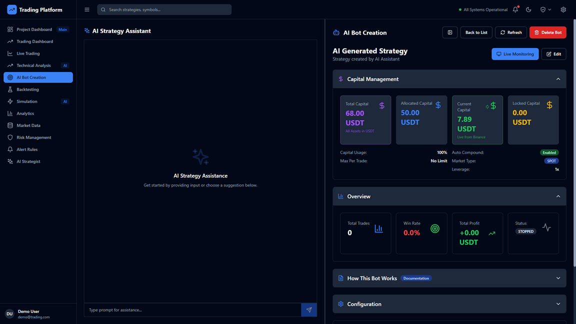 You stay in full control of risk and capital at all times. Allocate capital per bot, throttle active usage by percentage, cap exposure per trade, and compound profits automatically for accelerated growth. A configurable Confidence Threshold System (25–100%) lets you choose between higher activity or higher conviction. Under the hood, a real‑time WebSocket core delivers 100ms order book updates, while direct Binance integration provides live balances, positions, exchange‑validated orders, and transparent performance tracking.